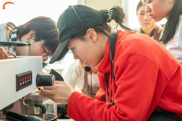 次日,咖啡實訓(xùn)區(qū)內(nèi),空氣中又添了幾分醇厚的香氣。主講人周欣欣老師身兼MCA大師咖啡聯(lián)盟沖煮一級、PCA拉花認(rèn)證二級等多項資質(zhì),她的課堂同樣充滿“技術(shù)流”的細膩。周老師從咖啡豆的烘焙程度、研磨粗細,到萃取時間的精準(zhǔn)控制,逐一進行講解示范。手沖咖啡的細流緩緩注入杯中,醇厚的香氣讓馬來西亞師生紛紛駐足。
