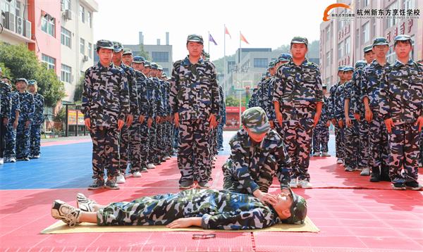 同學(xué)們以班級(jí)為單位組成方隊(duì),在教官的帶領(lǐng)下,依次進(jìn)行分列式匯報(bào)表演,接受領(lǐng)導(dǎo)的檢閱,F(xiàn)場(chǎng)表演了軍體拳、人工呼吸和胸外心臟按壓急救術(shù)、滅火器使用技巧。他們的隊(duì)列整齊,行動(dòng)一致;他們的斗志昂揚(yáng),勢(shì)如霹靂;他們出拳虎虎生威,踢腿凌厲有力;他們動(dòng)作干脆利落,口號(hào)高亢嘹亮!他們將杭州新東方學(xué)子的精氣神盡情展現(xiàn),贏得了在場(chǎng)領(lǐng)導(dǎo)和老師們的陣陣掌聲!