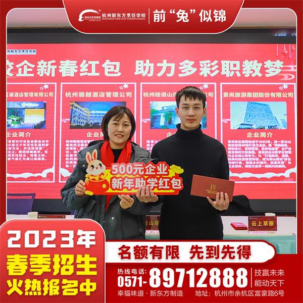 正值開學(xué)季,為助力大家實現(xiàn)技能成才夢。近日,杭州新東方職業(yè)學(xué)校攜手杭州君潤茗瀾酒店管理有限公司、杭州駱越酒店管理公司、杭州桂語山房餐飲有限公司、景尚旅游集團(tuán)股份有限公司四家企業(yè),現(xiàn)場派發(fā)校企新春紅包,歡迎新生學(xué)子報名入學(xué)。