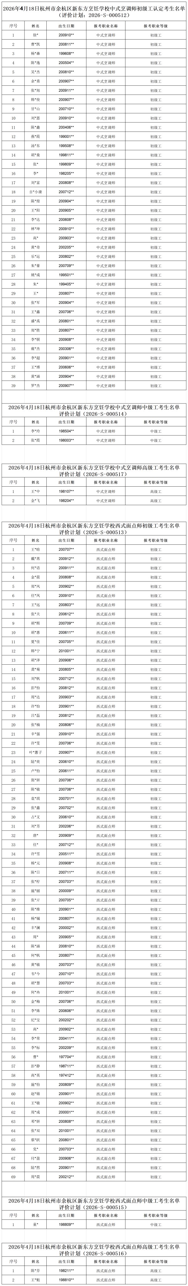 余杭區(qū)新東方烹飪學(xué)校2026年4月18日批次認(rèn)定花名冊